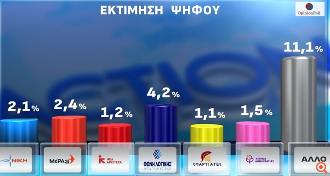 Ακολουθούν Πλεύση Ελευθερίας (10,4%), Ελληνική Λύση (10,1%), ΚΚΕ (8,2%), ΣΥΡΙΖΑ(4,2%) και Φωνή Λογικής (4,2%).