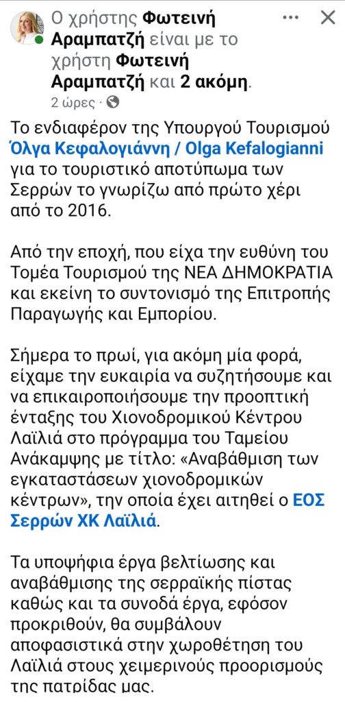 Σήμερα το πρωί, για ακόμη μία φορά, είχαμε την ευκαιρία να συζητήσουμε και να επικαιροποιήσουμε την προοπτική ένταξης του Χιονοδρομικού Κέντρου Λαϊλιά στο πρόγραμμα του Ταμείου Ανάκαμψης με τίτλο: «Αναβάθμιση των εγκαταστάσεων χιονοδρομικών κέντρων», την οποία έχει αιτηθεί ο ΕΟΣ Σερρών ΧΚ Λαϊλιά.
