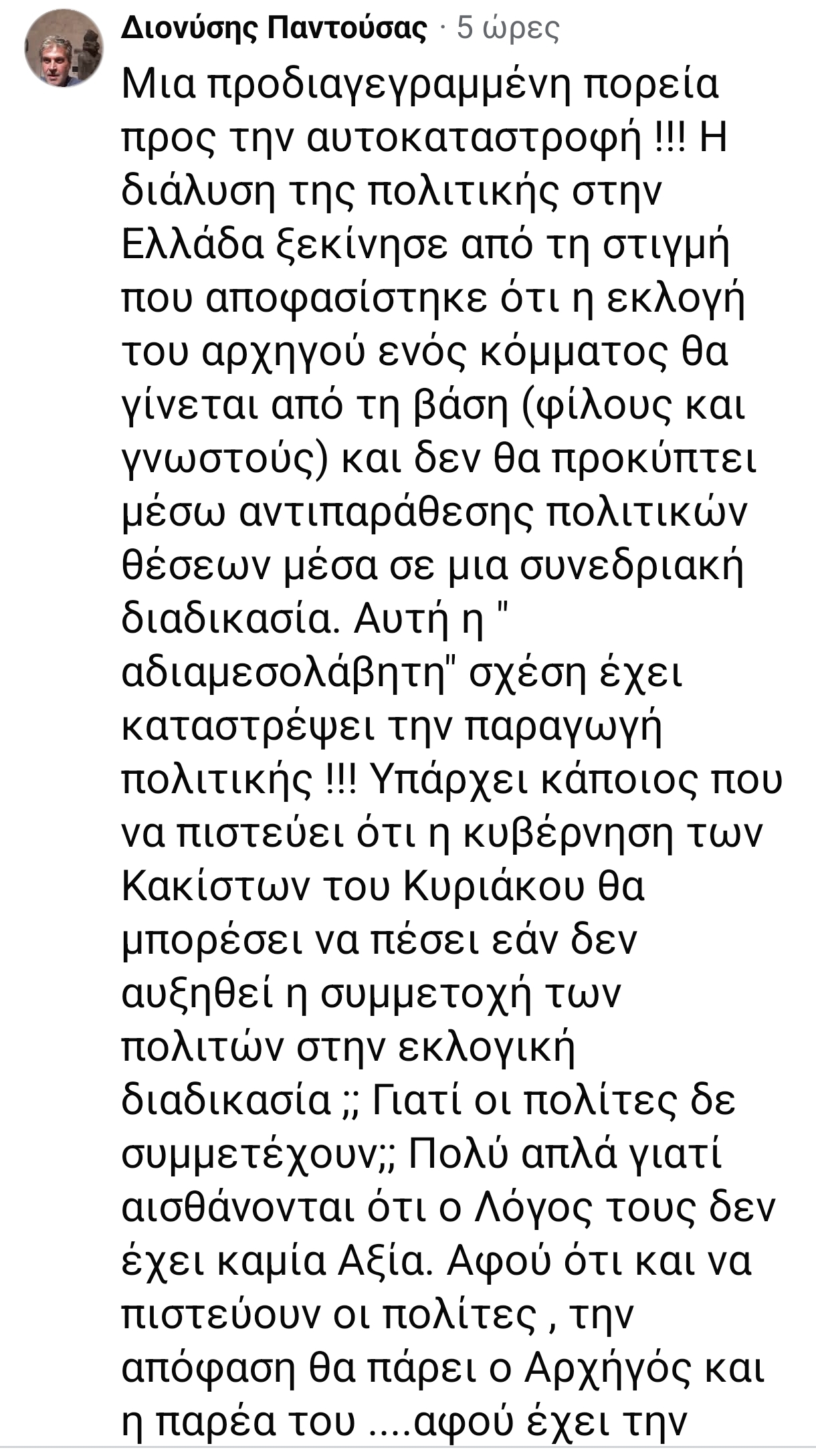 Η διάλυση της πολιτικής στην Ελλάδα ξεκίνησε από τη στιγμή που αποφασίστηκε ότι η εκλογή του αρχηγού ενός κόμματος θα γίνεται από τη βάση (φίλους και γνωστούς) και δεν θα προκύπτει μέσω αντιπαράθεσης πολιτικών θέσεων μέσα σε μια συνεδριακή διαδικασία.