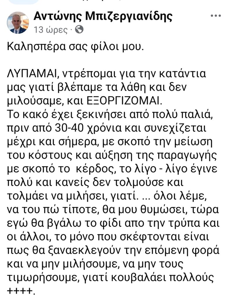 Το κακό έχει ξεκινήσει από πολύ παλιά, πριν από 30-40 χρόνια και συνεχίζεται μέχρι και σήμερα, με σκοπό την μείωση του κόστους και αύξηση της παραγωγής με σκοπό το κέρδος, το λίγο – λίγο έγινε πολύ και κανείς δεν τολμούσε και τολμάει να μιλήσει, γιατί. … όλοι λέμε, να του πώ τίποτε, θα μου θυμώσει, τώρα εγώ θα βγάλω το φίδι απο την τρύπα και οι άλλοι, το μόνο που σκέφτονται είναι πως θα ξαναεκλεγούν την επόμενη φορά και να μην μιλήσουμε, να μην τους τιμωρήσουμε, γιατί κουβαλάει πολλούς ++++.