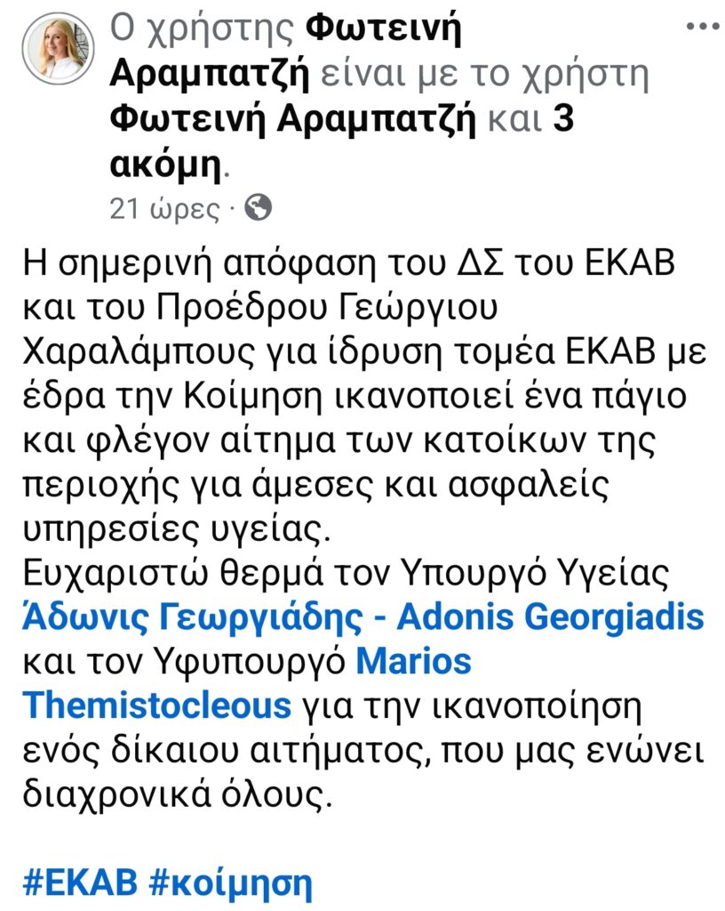 Την ικανοποίηση της για τη χθεσινή (10-2-26) απόφαση του ΔΣ του ΕΚΑΒ για αναβάθμιση της Βάσης του ΕΚΑΒ στην Κοίμηση σε Τομέα, εξέφρασε μέσα από τον προσωπικό της λογαριασμό στα μέσα κοινωνικής δικτύωσης, η Βουλευτής Σερρών της ΝΔ Φωτεινή Αραμπατζή.